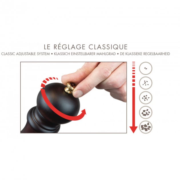 Pour régler la mouture du moulin à poivre et du moulin à sel Peugeot Tahiti Été, il n’y a rien de plus simple : tournez le bouton d’acier brossé jusqu’à la mouture souhaitée. Plus il est serré, plus la mouture sera fine, et inversement.